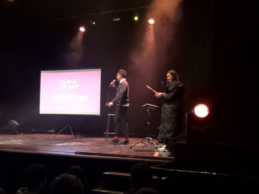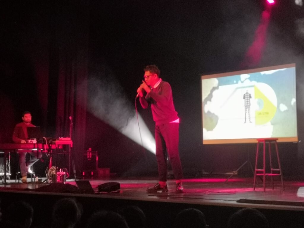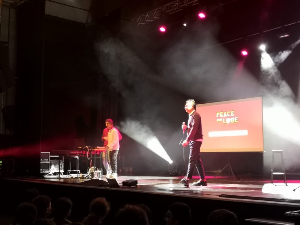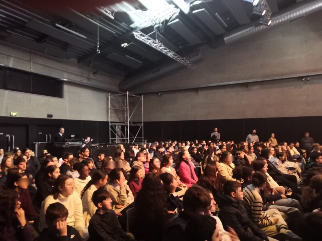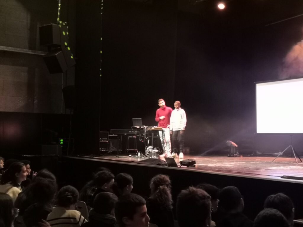 Mardi 25 novembre, l’ensemble des classes de 4e s’est rendu au Chato’do afin d’assister au spectacle Peace & lobe. Proposé depuis plusieurs années, ce spectacle, animé par le musicien slameur San-Seyha, aborde le fonctionnement du son amplifié, le rôle du technicien son, le fonctionnement de l’oreille, les risques auditifs et les gestes de prévention.